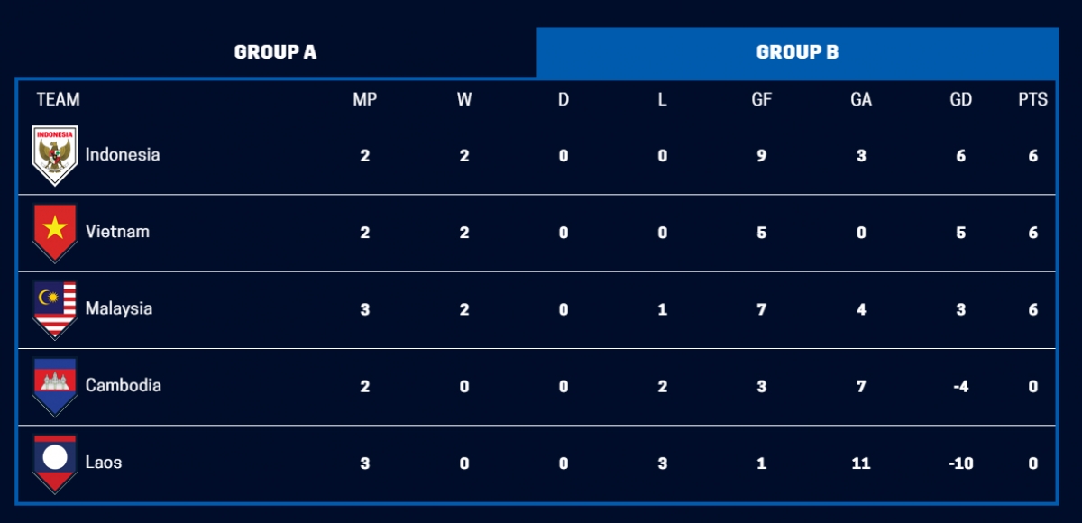 Xếp hạng bảng B.Hiện tại, ĐT Việt Nam đang có phong độ ổn định, hàng công chơi tốt và hàng thủ cũng rất chắc chắn, khi chưa để thủng lưới. Đoàn quân của HLV Park Hang Seo được đánh giá cao hơn Indonesia và người hâm mộ kỳ vọng, ĐT Việt Nam sẽ đánh bại đối thủ để sớm giành vé vào bán kết.