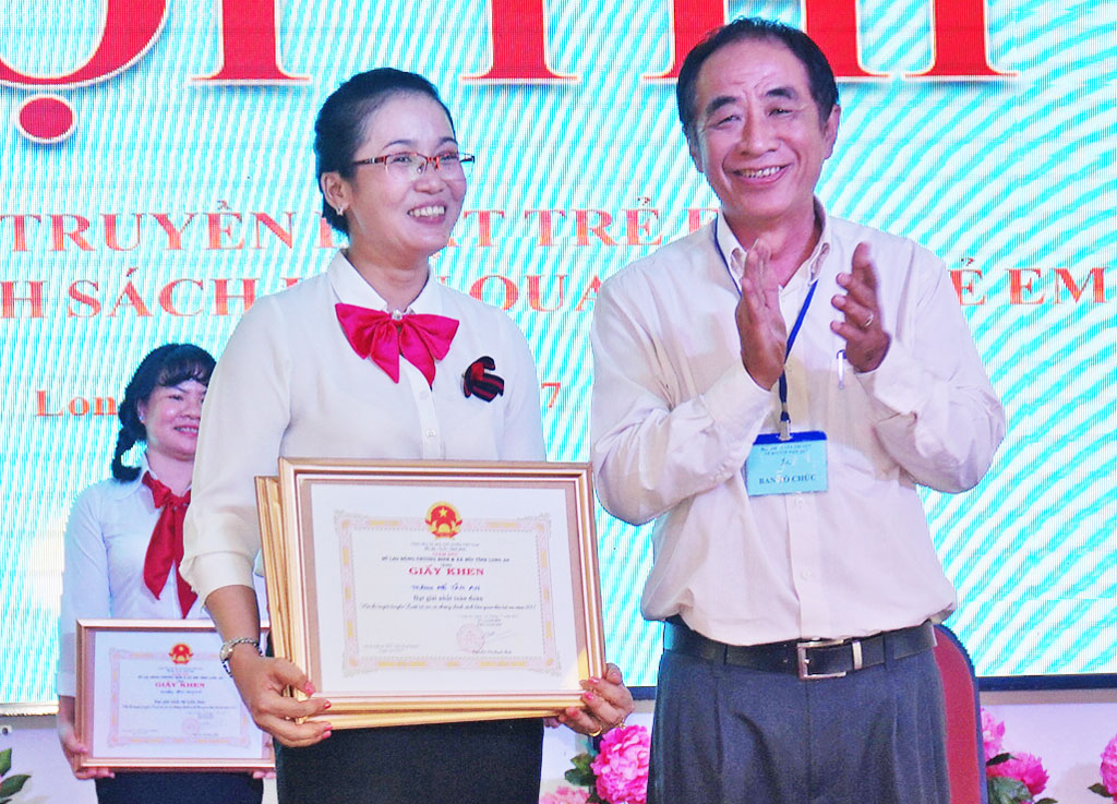 Phó Giám đốc Sở LĐ-TB&XH, Trưởng Ban Tổ chức cuộc thi - Hoa Thanh Niên trao giải nhất toàn đoàn cho đội TP.Tân An