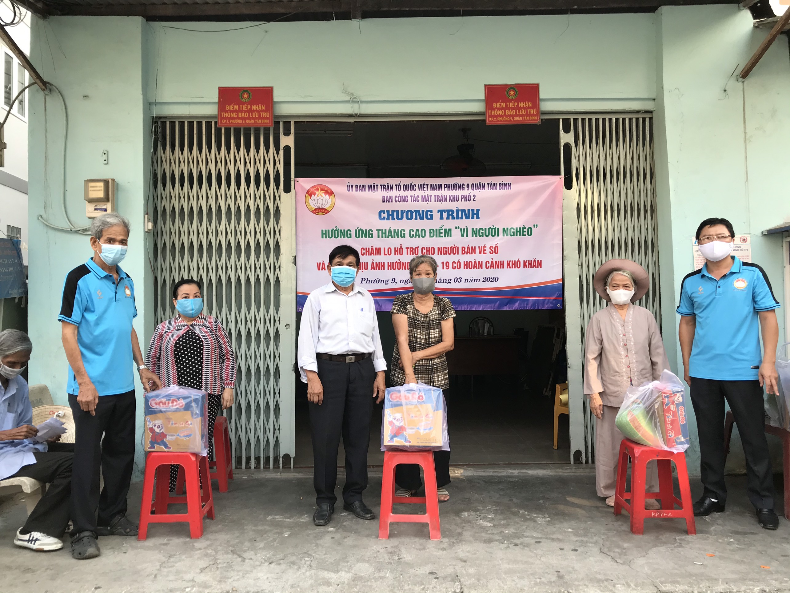 | MTTQ Việt Nam phường 9 (TP. Hồ Chí Minh) tặng quà cho người bán vé số, người bị ảnh hưởng bởi dịch tại khu phố 1 và 2. (Ảnh: Thu Nguyệt) |