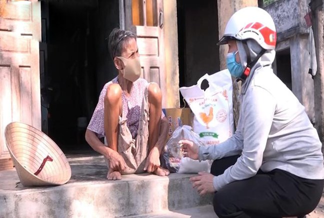 | Đại diện Ủy ban MTTQ Việt Nam xã Bình Mỹ (Bình Sơn, Quảng Ngãi) hỗ trợ lương thực cho người già, có hoàn cảnh khó khăn tại địa phương. (Ảnh: H.T) |