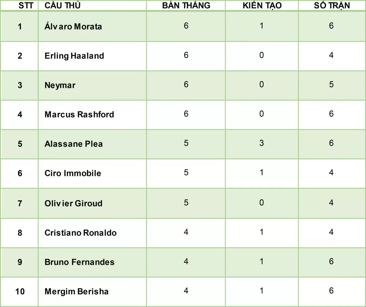 Hiện tại, Ronaldo đang kém nhóm dẫn đầu là Álvaro Morata, Erling Haaland và Neymar 2 bàn thắng. Marcus Rashford của MU cũng ghi được 6 bàn thắng, nhưng cầu thủ này không còn cơ hội gia tăng thành tích, khi “Quỷ đỏ” đã bị loại.