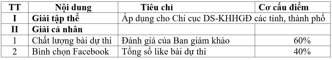 - Tổng số thích (like) bài dự thi trên fanpage facebook “Hạnh phúc Gia đình” là tiêu chí chấm giải (40% điểm số).
