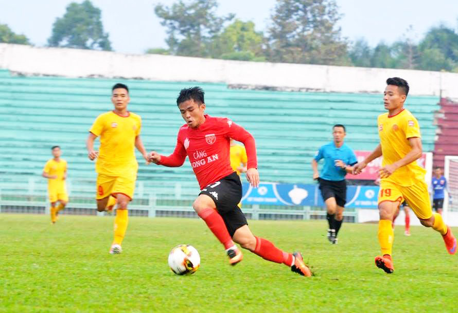Tân binh Nguyễn Thái Sung (áo đỏ) có trận cầu ra mắt khán giả Long An không thành công