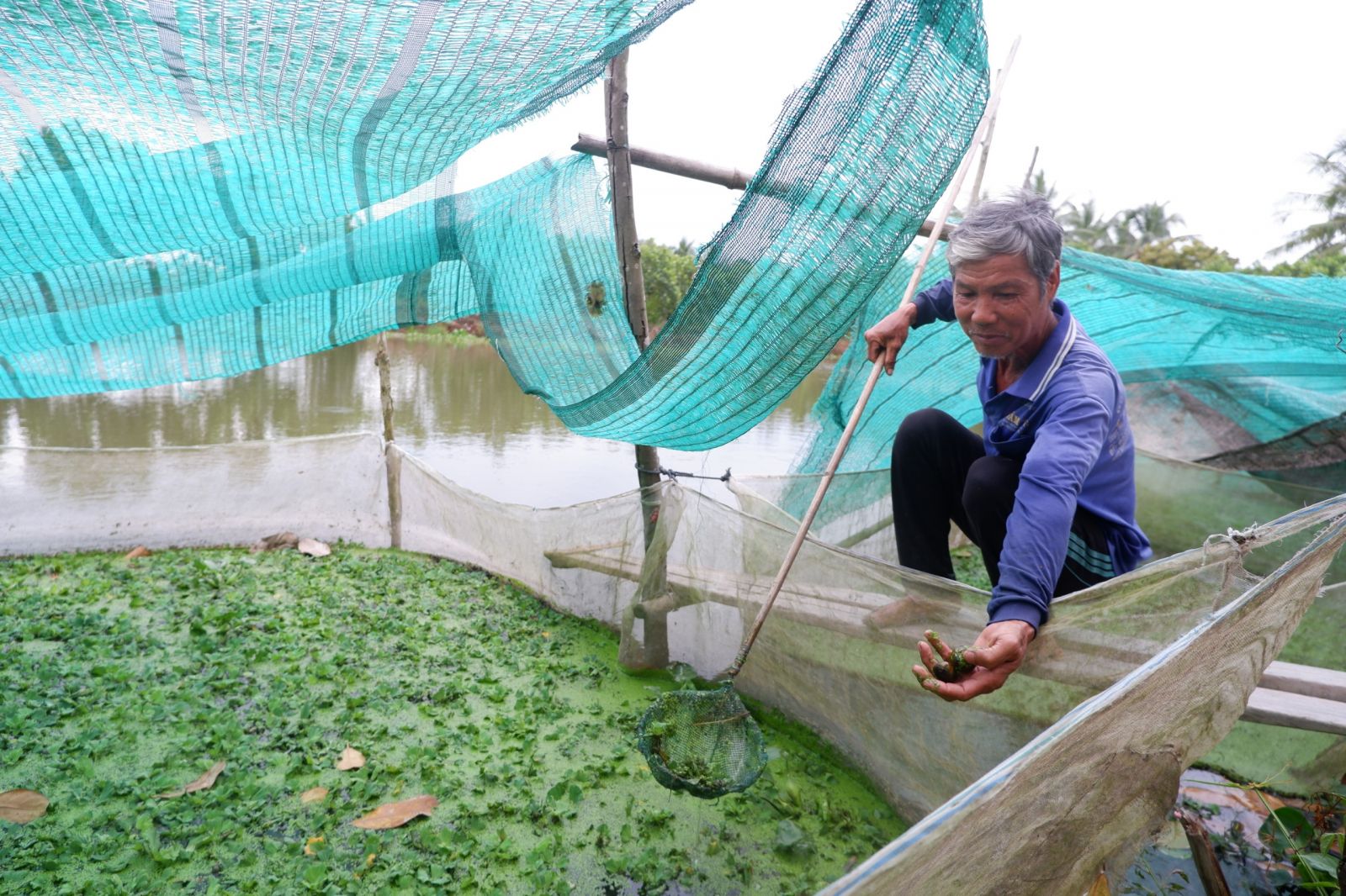 Dù kinh tế gia đình khá giả sau bao nhiêu năm nỗ lực nhưng CCB Nguyễn Văn Xây vẫn không ngừng cố gắng. Theo đó, ông tìm tòi các mô hình phát triển kinh tế mới, với mong muốn vừa đem về thu nhập cho gia đình, vừa mở ra hướng đi mới cho người dân quê mình. Nghĩ là làm, cách đây 2 năm, ông bắt đầu nuôi thử nghiệm ốc bươu đen và ốc lác thịt. Ông Xây chia sẻ: “Trăn trở sau nhiều vụ nuôi cá tra thất bại, tôi quyết định mua 10.000 con ốc giống về thả vào ao nuôi kết hợp trồng mít trên bờ ao để tận dụng mít dạt làm thức ăn cho ốc. Sau khoảng 4-5 tháng thả nuôi, gia đình tôi bắt đầu thu hoạch ốc thịt để bán, trọng lượng khoảng 20-30 con/kg, giá bán từ 50.000 đồng/kg trở lên. Thấy mô hình mang lại hiệu quả kinh tế cao, tôi bắt đầu thử sức với việc ươm ốc giống. Để tạo môi trường thuận lợi cho ốc sinh sản, tôi thả vào trong ao nuôi các tấm mành làm vèo cho ốc đẻ trứng, trung bình mỗi tháng thu hoạch 20kg trứng ốc, giá bán từ 300.000 đồng/kg trở lên, cá biệt có thời gian bán 1 triệu đồng/kg; còn ốc giống cung cấp cho thị trường khoảng 40.000 con/tháng, giá bán từ 200-300 đồng/con. Qua đó, gia đình tôi thu về lợi nhuận hàng chục triệu đồng/tháng”.