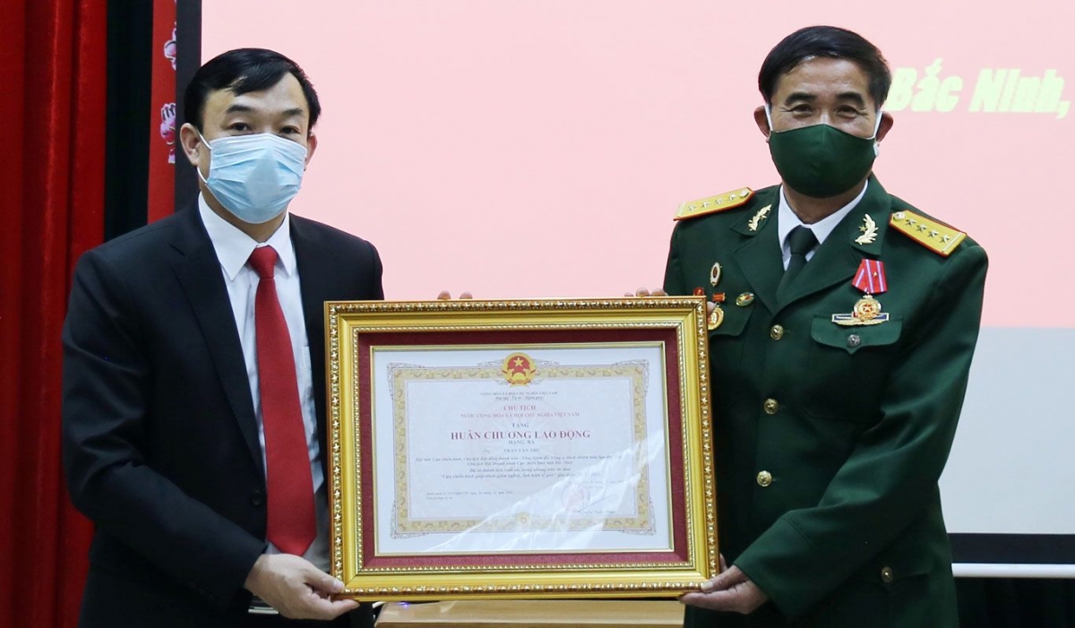 | Doanh nhân CCB Trần Văn Thư (bên phải) nhận Huân chương Lao động hạng Ba, ngày 11/1/2022, tại Hội CCB tỉnh Bắc Ninh (Nguồn: vov.vn) |