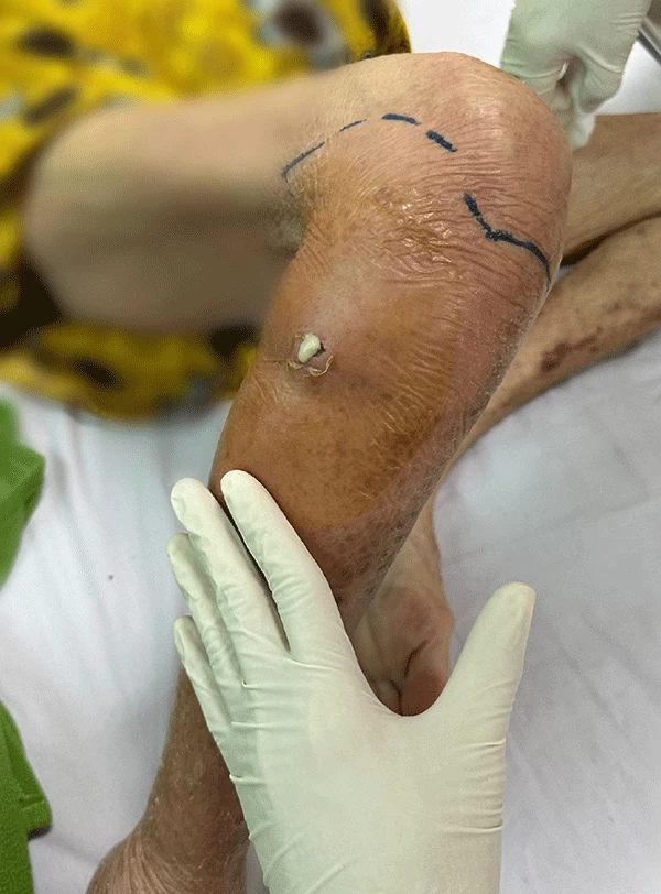 Chân cụ bà mưng mủ từ vết xước nhỏ.