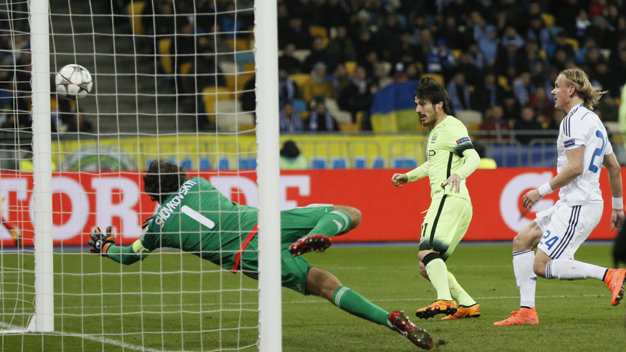 Phút 40, từ đường chuyền dài vượt tuyến của Clichy, Aguero thoát xuống giữ bóng khéo léo trong vòng cấm lôi kéo các hậu vệ Dynamo Kiev rồi thực hiện pha đánh gót tinh tế cho Sterling băng lên. Trong tư thế trống trải, Sterling dễ dàng thực hiện đường căng ngang cho Silva đệm bóng vào lưới trống, nâng tỉ số lên 2-0 cho M.C.