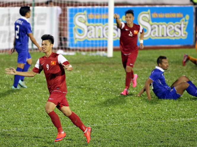 Tiền đạo Văn Thành (9) ăn mừng bàn thắng vào lưới U-21 Thái Lan. Ảnh: N.K