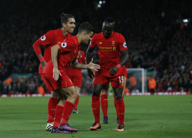 Coutinho ăn mừng bàn nâng tỉ số lên 2-0 cho Liverpool. Ảnh: Reuters