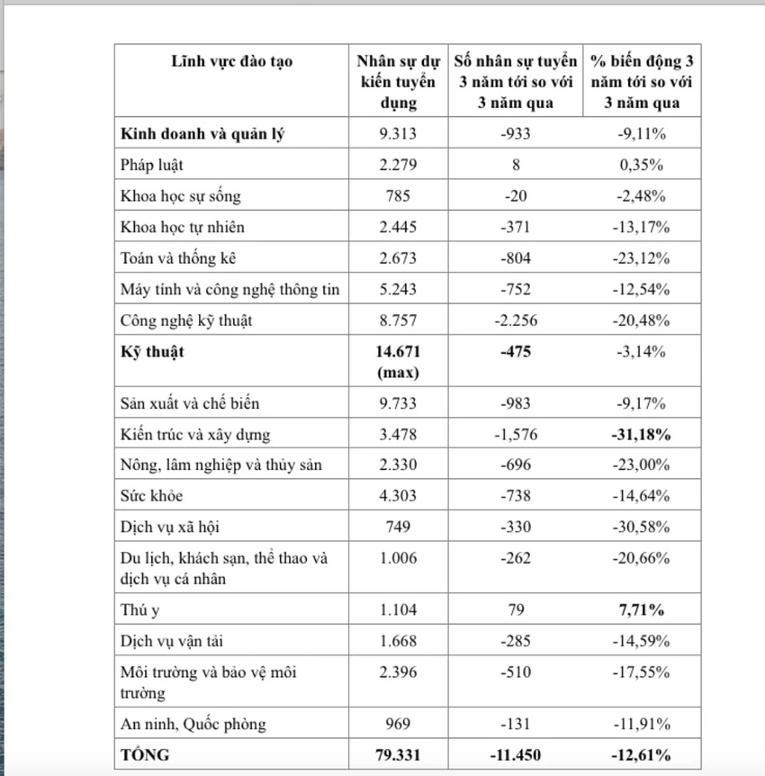 Ngoài ra, các lĩnh vực có trung bình nhân sự dự kiến tuyển giảm đáng kể (trên 20%) là lĩnh vực Nghệ thuật (-23,30%); Toán và thống kê (-23,12%); Công nghệ kỹ thuật (-20,48%); Nông, lâm nghiệp và thủy sản (-23,00%); Du lịch, khách sạn, thể thao và dịch vụ cá nhân (-20,66%).