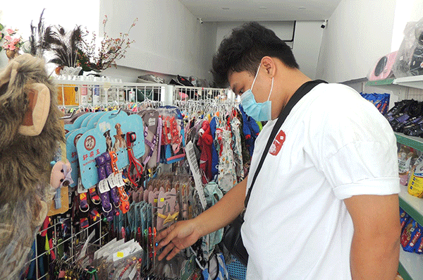 Khách hàng chọn mua phụ kiện cho thú cưng tại Siêu thị Thức ăn thú cưng, đường 30 Tháng 4. Ảnh: MỸ THANH.