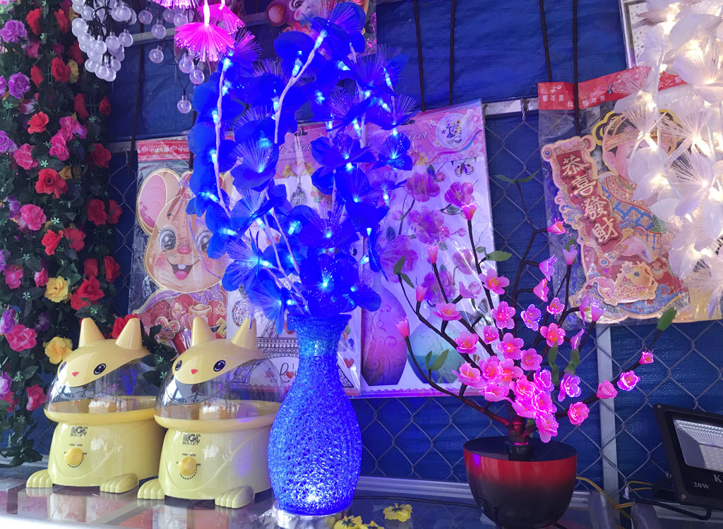 Những ngày cận tết, trên nhiều tuyến đường, người dân bày bán hàng loạt sản phẩm liên quan đến việc trang hoàng nhà cửa, góp phần mang đến không khí đầm ấm, vui tươi của Tết Nguyên đán Canh Tý 2020. Hơn 2 tuần qua, gian hàng phục vụ tết trước Trung tâm Thương mại Vincom thu hút khá nhiều người. Anh Võ Thành Luân - chủ cửa hàng, chia sẻ: “Gian hàng trưng bày hơn 100 sản phẩm, gồm: Hoa vải, đèn led, lọ hoa, lồng đèn,... Khác với nhiều năm trước, vật trang trí khá đa dạng, được sản xuất từ thủ công đến bằng công nghệ hiện đại, trong nước lẫn nhập khẩu. Các hàng hóa này có giá từ vài chục ngàn cho đến tầm 1 triệu đồng”.