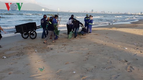 Công nhân công ty môi trường thu gom, xử lý cá chết tại bãi biển Liên Chiểu