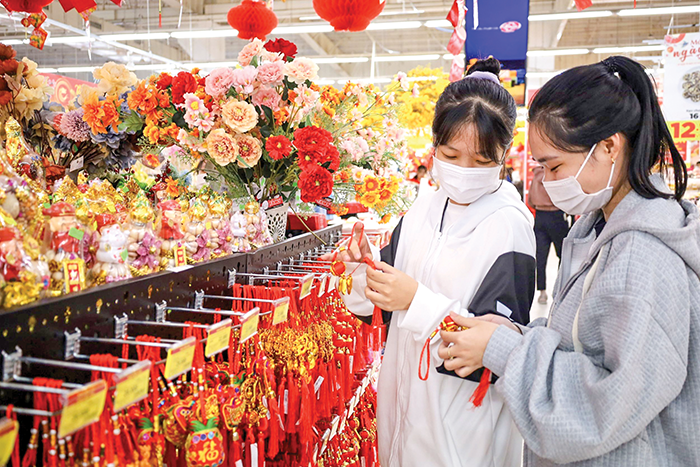 Thị trường đồ trang trí Tết đã vào mùa kinh doanh sôi động. Tại các siêu thị, nhà sách, cửa hàng kinh doanh vật dụng trang trí nhà cửa trưng bày rực rỡ sắc màu của các món đồ trang trí Tết với mẫu mã đa dạng, hình thức bắt mắt, phục vụ đa dạng nhu cầu trang hoàng nhà cửa đón xuân của người dân.