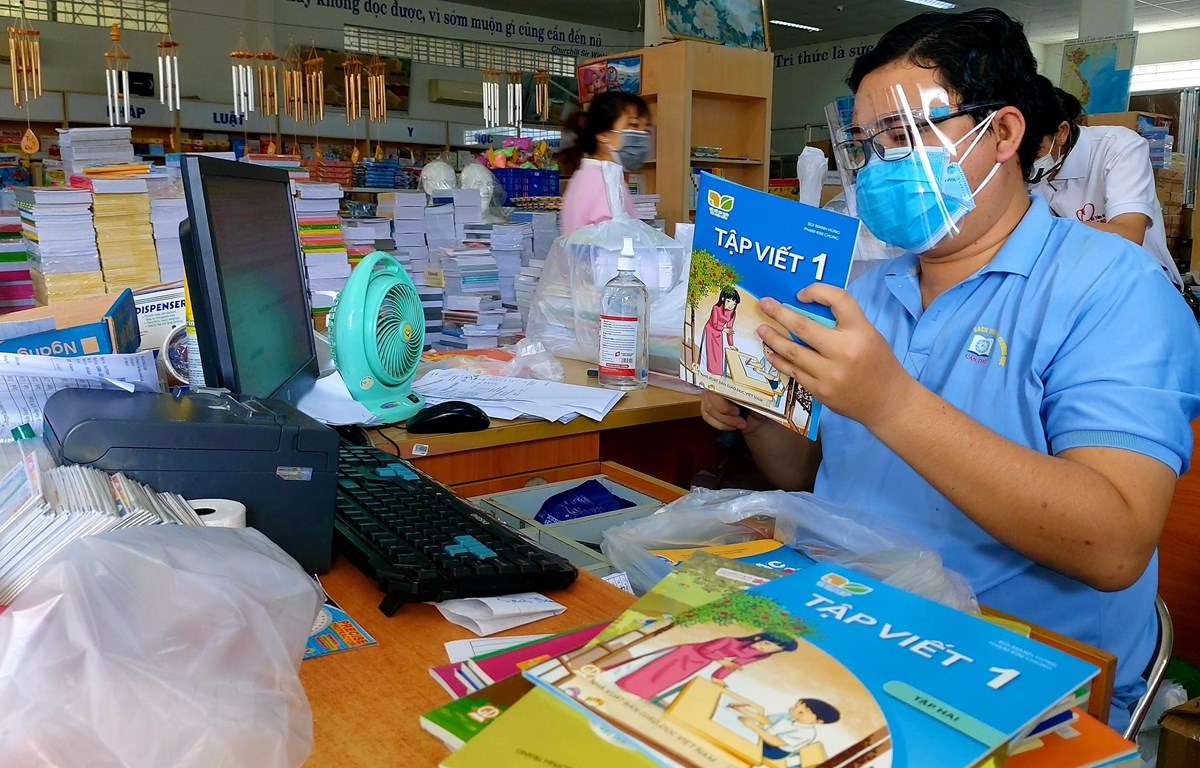 Nhân viên nhà sách Thiết bị giáo dục Cần Thơ soạn đơn hàng cho khách đặt trực tuyến. (Ảnh: Thu Hiền/TTXVN)