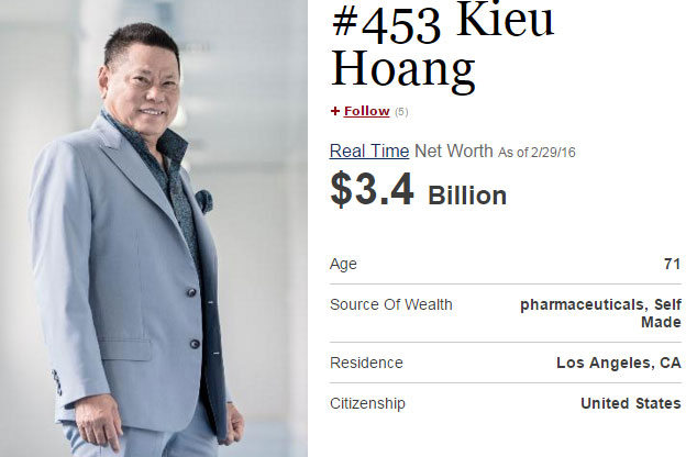 Hồi tháng 9/2015, ông Hoàng Kiều lần đầu tiên lọt vào top 400 người giàu nhất nước Mỹ.