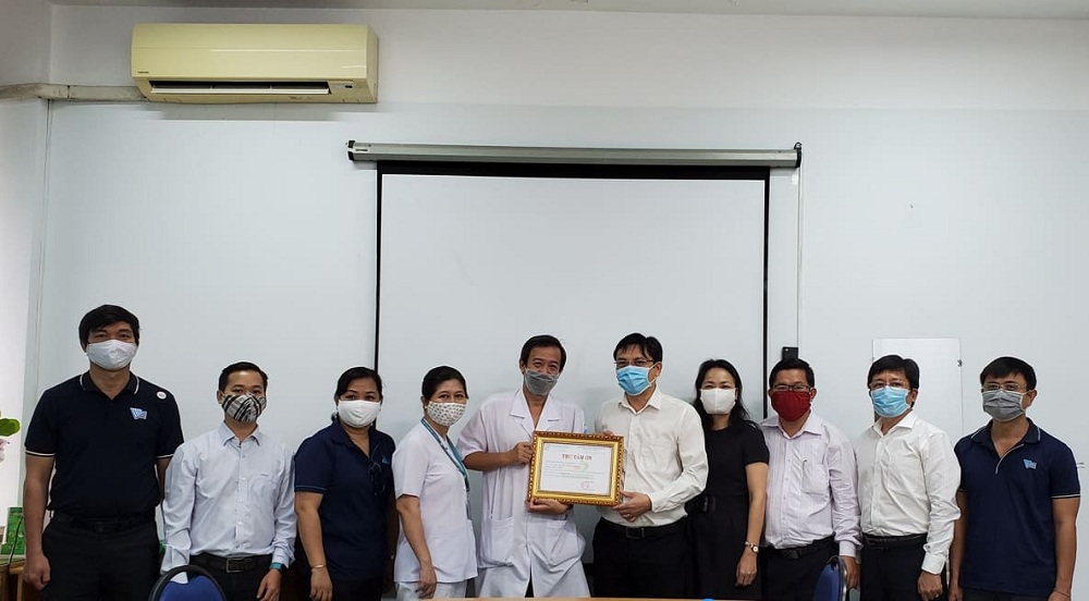 | Đại diện y bác sĩ Bệnh viện Bệnh nhiệt đới TP.Hồ Chí Minh (bên tay trái) trao thư cảm ơn ĐHQG TP. Hồ Chí Minh. (Ảnh: Phùng Quán) |