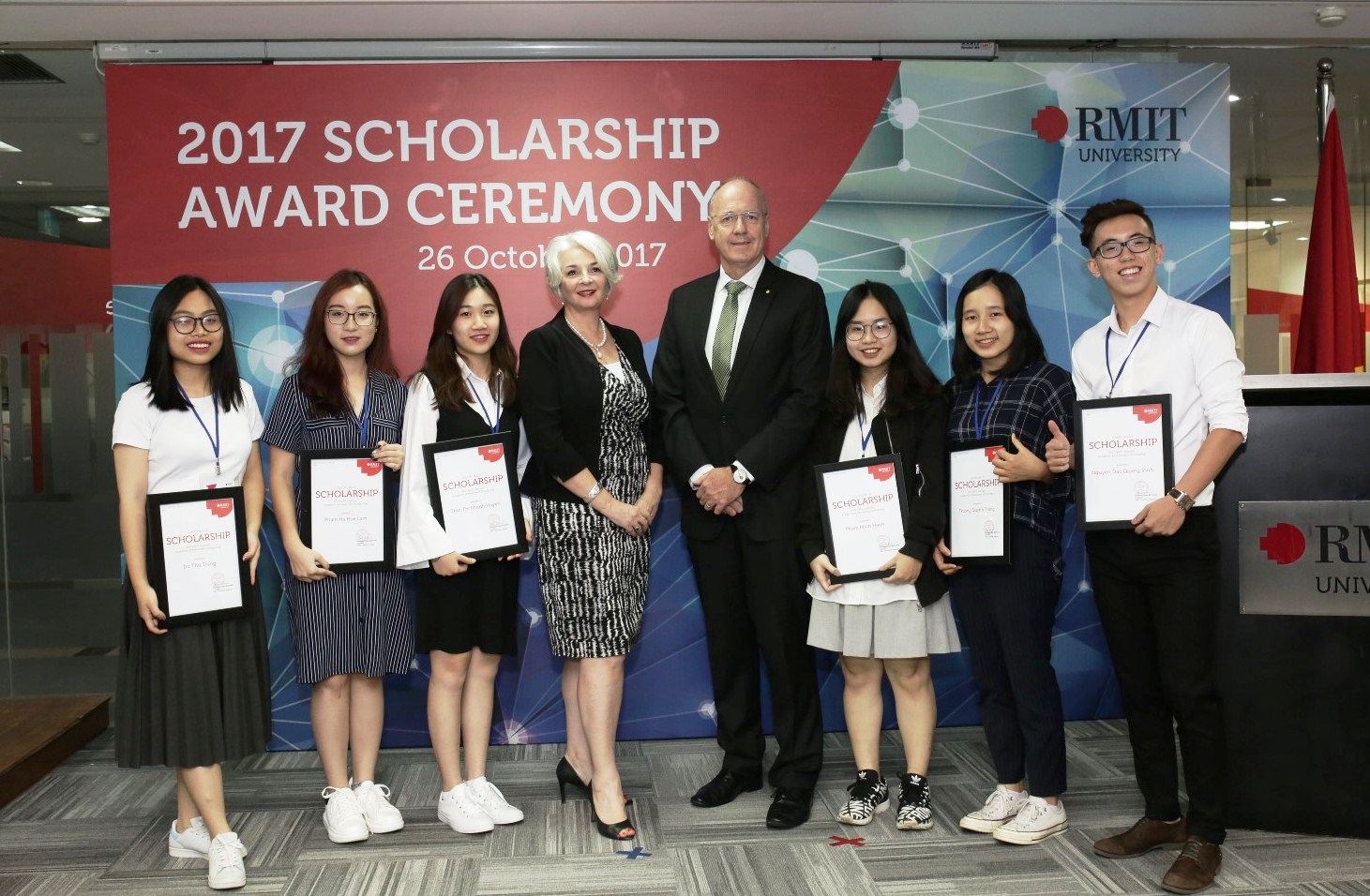 Tại Lễ trao học bổng diễn ra tại Hà Nội và thành phố Hồ Chí Minh, Đại học RMIT Việt Nam đã trao 9 suất Học bổng Hiệu trưởng cho 9 sinh viên, trong đó có một suất mới từ Qũy học bổng RMIT Việt Nam – Vietcombank. Học bổng Hiệu trưởng là hạng mục học bổng danh giá nhất của RMIT Việt Nam, dành để trao cho những học sinh trung học nổi bật có thành tích học tập xuất sắc, đồng thời tích cực tham gia các hoạt động cộng đồng và thể hiện được tiềm năng lãnh đạo.