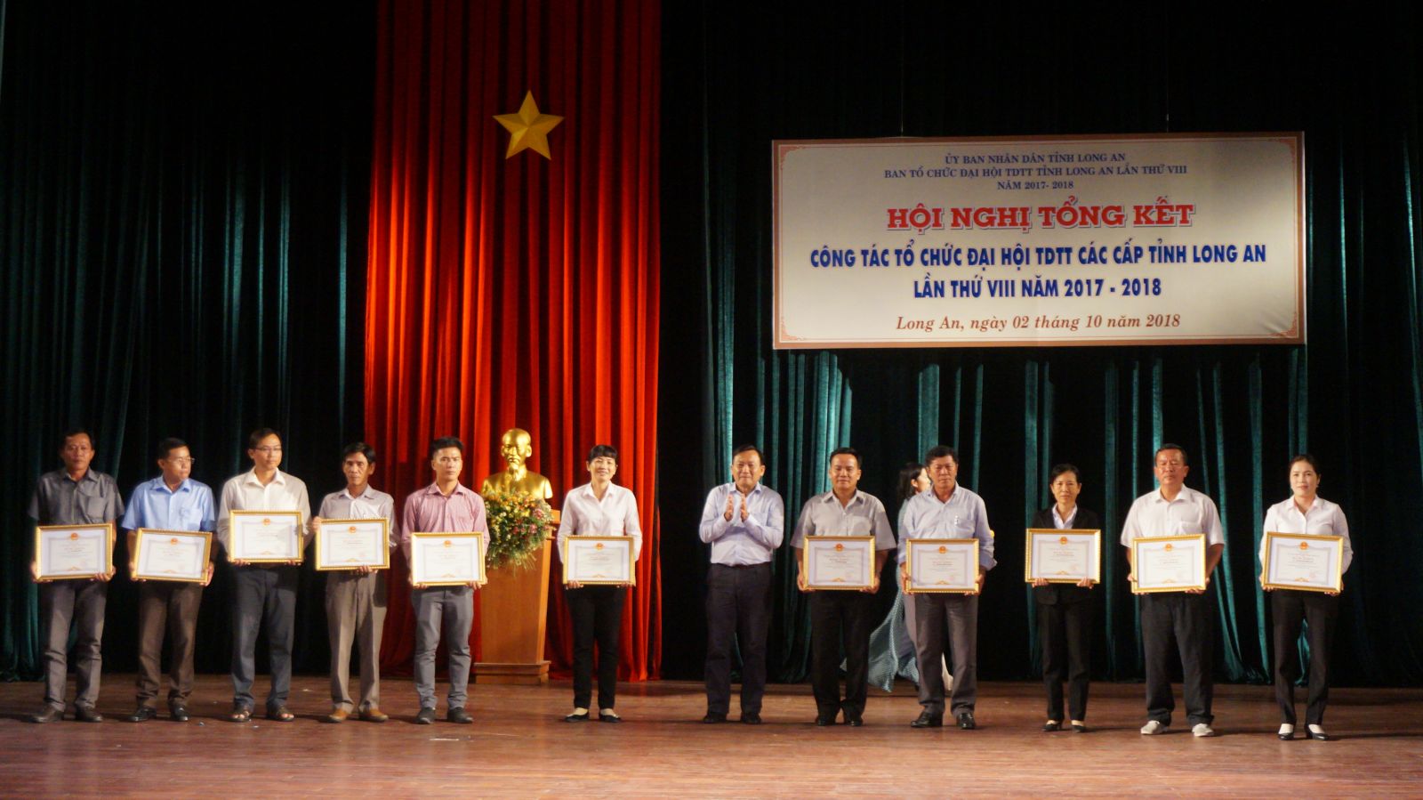 Với những thành tích tốt trong tổ chức Đại hội TDTT các cấp lần thứ VIII, tại hội nghị tổng kết, đơn vị TP. Tân An được UBND tỉnh tặng cờ thi đua xuất sắc; 18 tập thể và 21 cá nhân nhận Bằng khen của Chủ tịch UBND tỉnh./.