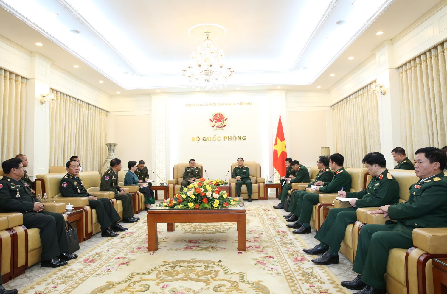 Đại tướng Phan Văn Giang đánh giá cao kết quả hội đàm trước đó giữa Thượng tướng Nguyễn Tân Cương, Ủy viên Trung ương Đảng, Ủy viên Thường vụ Quân ủy Trung ương, Tổng Tham mưu trưởng Quân đội nhân dân Việt Nam, Thứ trưởng Bộ Quốc phòng và Đại tướng Vong Pisen.