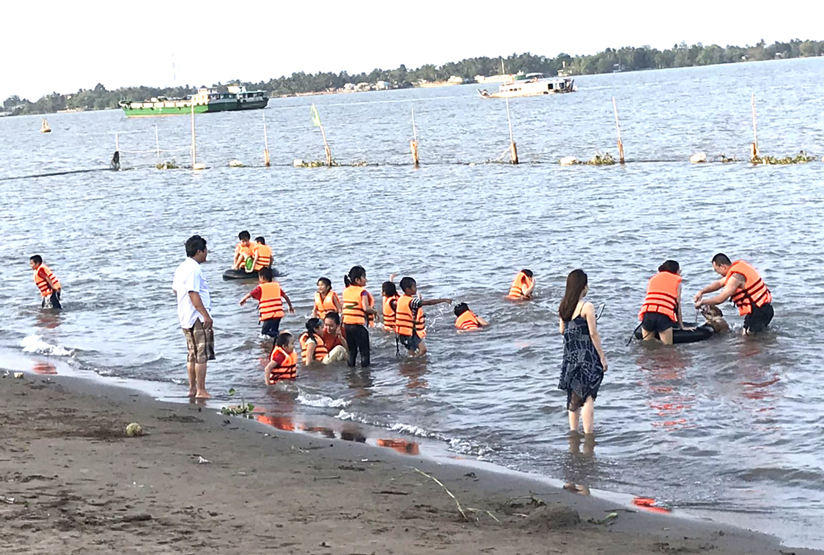 Cách đây mấy hôm, tôi có đưa con đến bãi tắm sông Hậu (phường Cái Khế, quận Ninh Kiều) chơi. Buổi chiều, có rất nhiều trẻ em đến đây tắm, bơi lội. Nhân viên của Khu du lịch sông Hậu và bảo vệ khu vực bãi tắm nhắc nhở phụ huynh cho trẻ mặc áo phao trước khi xuống nước để đảm bảo an toàn và mọi người đều thực hiện tốt quy định này (ảnh). Có gia đình người lớn khi xuống bãi tắm vui đùa với trẻ cũng mặc áo phao rồi giải thích ích lợi để con trẻ bắt chước làm theo. Tôi để ý mỗi nhóm trẻ bơi có người lớn theo trông chừng, nhân viên bãi tắm cũng thường xuyên đi lại kiểm tra.
