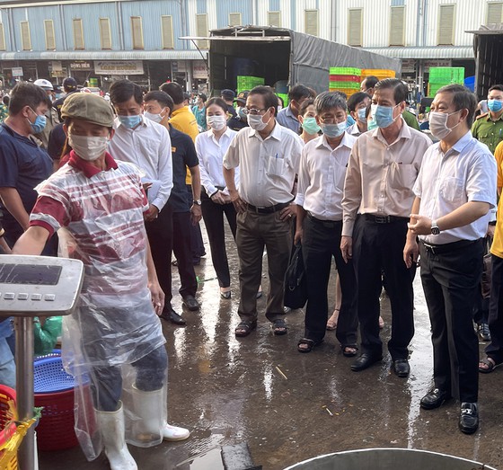| Đoàn lãnh đạo UBND TP Hồ Chí Minh kiểm tra công tác an toàn thực phẩm và phòng chống dịch tại chợ đầu mối Bình Điền, TP Hồ Chí Minh (Ảnh: HOÀNG HÙNG) |