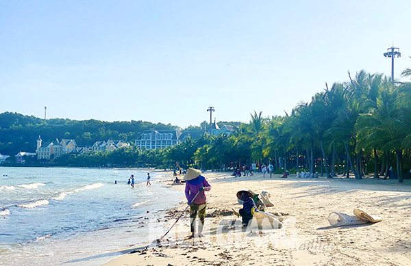 Gắn bó với công việc dọn vệ sinh trên bãi biển hơn 10 năm, anh Trần Văn Khánh, phụ trách dọn vệ sinh công cộng khu vực Dinh Cậu, TP. Phú Quốc chia sẻ: “Mùa cao điểm du lịch như dịp lễ, tết, tôi phải dọn vệ sinh bãi biển sớm hơn. Hơn nữa, nơi đây khách du lịch và người dân có thói quen tắm biển buổi sáng để ngắm bình minh, tôi phải tranh thủ dọn sớm”.