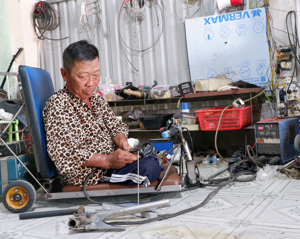 Chúng tôi gặp ông Cao Công Thành khi ông đang loay hoay hàn các dụng cụ chế tạo xe chạy bằng điện đi trong nhà cho NKT. Ông Thành chia sẻ: “NKT đi lại rất khó khăn, thường phải nhờ sự hỗ trợ của người khác nên rất bất tiện. Vì vậy, tôi nghiên cứu làm ra chiếc xe dành riêng cho NKT sinh hoạt trong nhà. Xe được thiết kế chiều ngang 50cm, dài 70cm, có 3 bánh, tốc độ 25km/h, bình quân giá bán dao động từ 5-7 triệu đồng/chiếc. Ngoài chế tạo xe cho NKT, tôi còn chế tạo trên 100 sản phẩm như máy nâng NKT, máy gọt dừa đa năng,... Những sản phẩm này được nhiều khách hàng trong và ngoài tỉnh ủng hộ”.