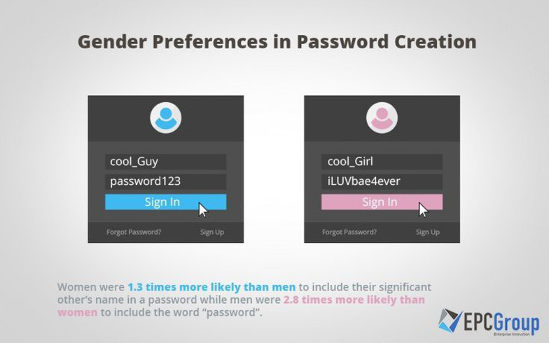 Mới đây, nhóm tư vấn công nghệ EPC Group đã đưa ra một cuộc khảo sát mới đã cho thấy sự khác nhau trong cách mật khẩu giữa đàn ông và phụ nữ. Cuộc khảo sát chủ yếu được tiến hành tại Mỹ.