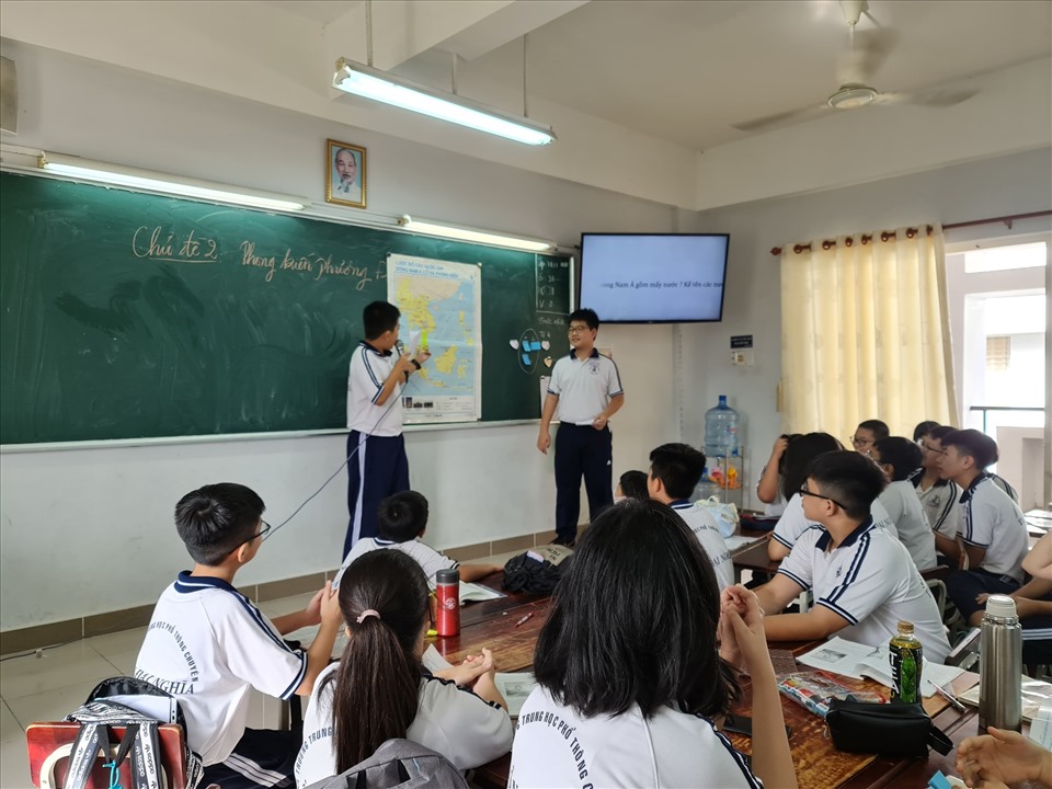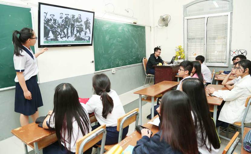 | Học sinh Trường THPT chuyên Trần Đại Nghĩa (Thành phố Hồ Chí Minh) thuyết trình tiết học Lịch sử. Ảnh: H.Thảo. |