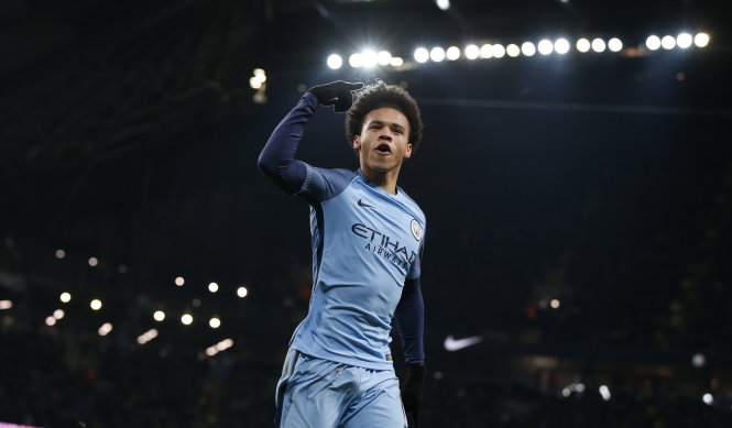 Niềm vui của Sane sau khi mở tỉ số cho M.C. Ảnh: Reuters