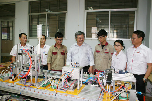 | Tổng cục trưởng Tổng cục GDNN Nguyễn Hồng Minh (giữa) thăm hỏi, động viên các thí sinh và chuyên gia nghề tự động hoá công nghiệp để chuẩn bị cho kỳ thi tay nghề ASEAN lần thứ 12 |