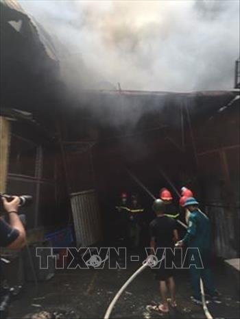 Lực lượng chữa cháy quận Long Biên đang tích cực dập tắt vụ cháy (Ảnh: Lâm Khánh - TTXVN)