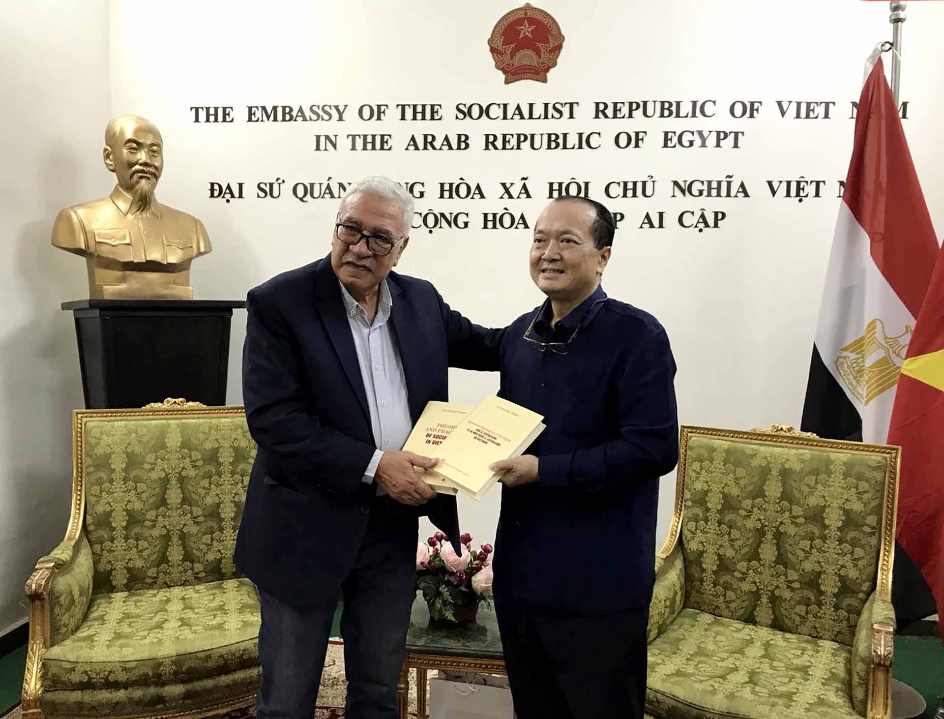 Nhân dịp này, Đại sứ Nguyễn Huy Dũng đã trân trọng trao tặng Tổng Bí thư Đảng Cộng sản Ai Cập Salah Adly cuốn sách “Một số vấn đề lý luận và thực tiễn về Chủ nghĩa xã hội và con đường đi lên Chủ nghĩa xã hội ở Việt Nam” của Tổng Bí thư Nguyễn Phú Trọng, bản tiếng Anh và Pháp.