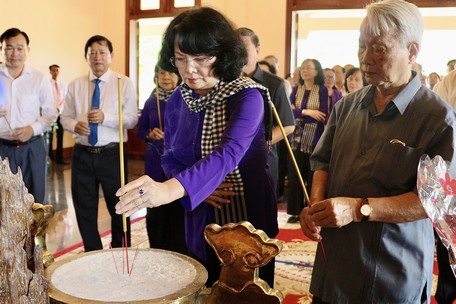 | Nguyên Ủy viên Trung ương Đảng, nguyên Phó Chủ tịch nước, nguyên Bí thư Tỉnh ủy Vĩnh Long Đặng Thị Ngọc Thịnh thắp hương tưởng niệm Thủ tướng Võ Văn Kiệt (Ảnh: Nguyên Khánh) |