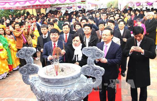 Bộ trưởng Bộ Y tế Nguyễn Thị Kim Tiến và lãnh đạo tỉnh Hưng Yên dâng hương tại Khu di tích Hải Thượng Lãn Ông. (Ảnh: Mai Ngoan - TTXVN)