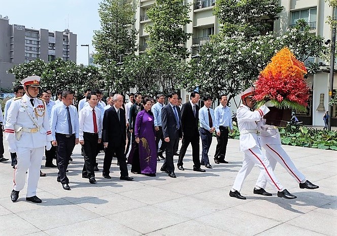 Trước tượng đài Chủ tịch Hồ Chí Minh, đoàn đã dành phút mặc niệm tưởng nhớ Người, vị lãnh tụ thiên tài, người thầy của cách mạng Việt Nam, Anh hùng giải phóng dân tộc, nhà văn hóa kiệt xuất của Việt Nam đã dành trọn cuộc đời cho sự nghiệp cách mạng, cho độc lập dân tộc để nhân dân được hưởng cuộc sống ấm no, hạnh phúc. Tiếp nối truyền thống đó, lãnh đạo và nhân dân TP. Hồ Chí Minh nguyện cống hiến năng lực, trí tuệ và nhiệt huyết của mình để xây dựng Thành phố ngày càng phát triển, có chất lượng sống tốt, văn minh, hiện đại, nghĩa tình.