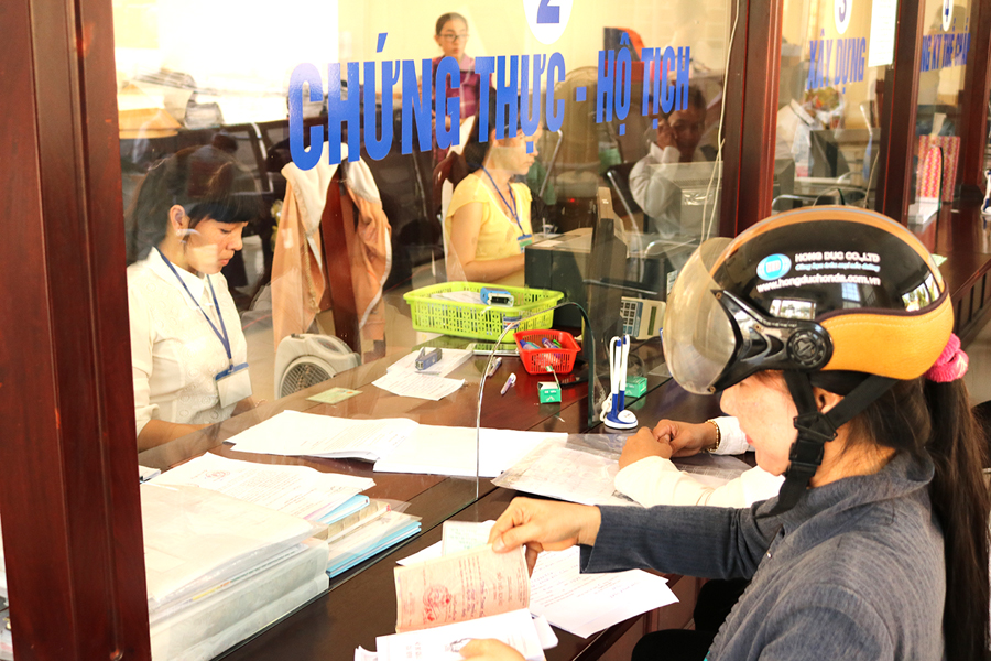 Người dân làm thủ tục hộ tịch có yếu tố nước ngoài tại Bộ phận Tiếp nhận và Trả kết quả của UBND huyện Thới Lai, TP Cần Thơ. Ảnh: Chấn Hưng