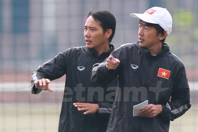 Huấn luyện viên Miura (phải) tin rằng thời tiết trong Nam sẽ giúp các cầu thủ có thể lực sung mãn hơn. (Ảnh: Minh Chiến/Vietnam+)