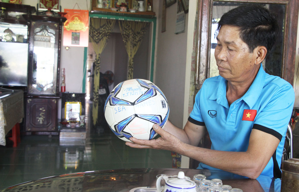 Gia đình vừa là hậu phương, vừa là động lực cho Kim Thanh (Trong ảnh: Cha của Kim Thanh với quả bóng con gái mang về từ SEA Games 29)