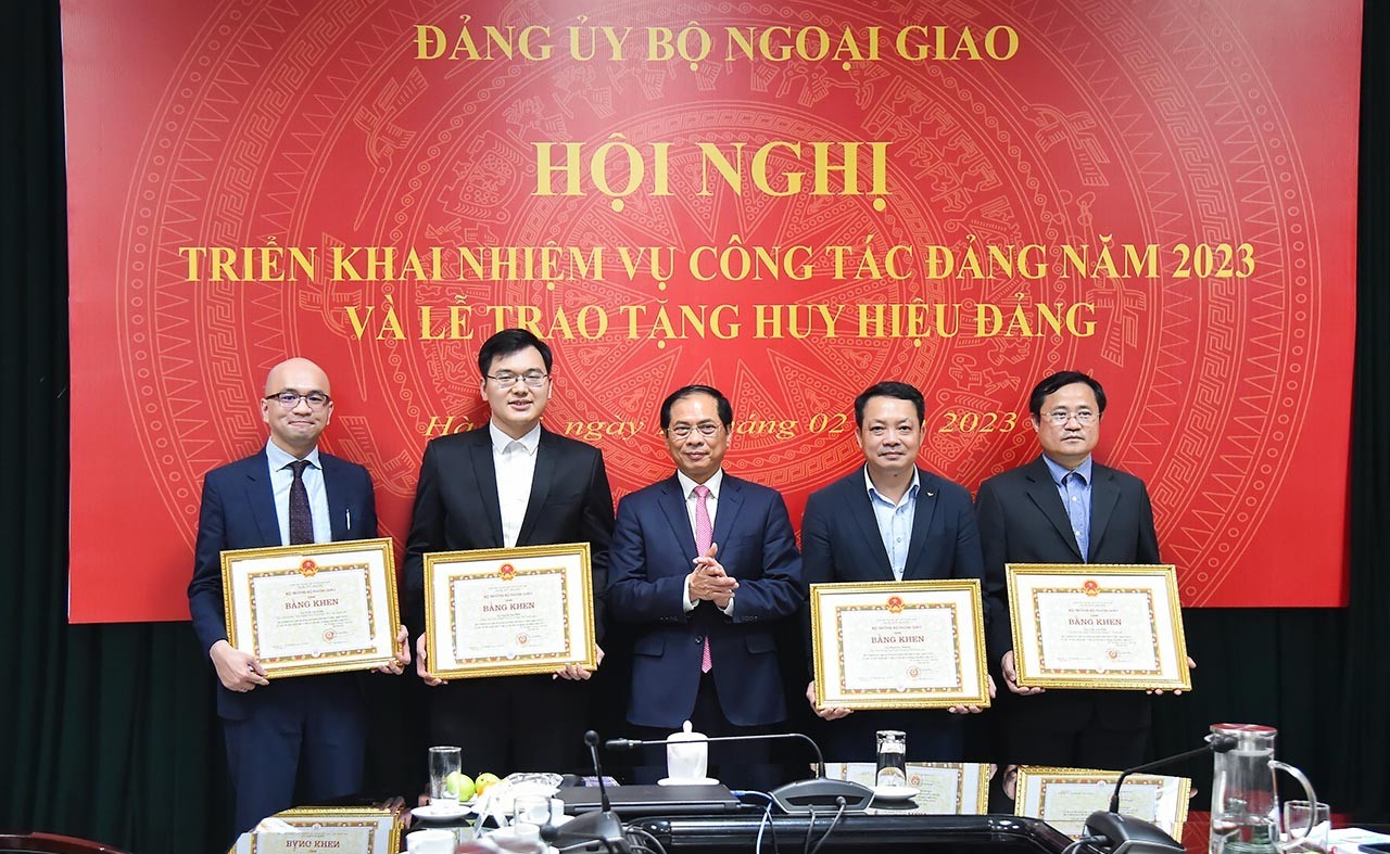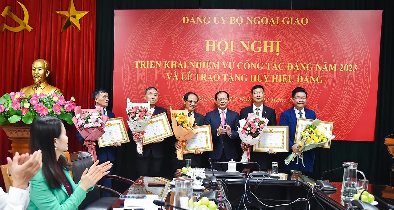 Ngày 13/2, tại Hà Nội, Đảng ủy Bộ Ngoại giao đã tổ chức Hội nghị triển khai công tác Đảng năm 2023 và trao tặng Huy hiệu 30 năm, 40 năm tuổi Đảng, Ủy viên Trung ương Đảng, Bộ trưởng Ngoại giao, Bí thư Ban cán sự Đảng, Bí thư Đảng ủy Bộ Ngoại giao Bùi Thanh Sơn chủ trì Hội nghị.