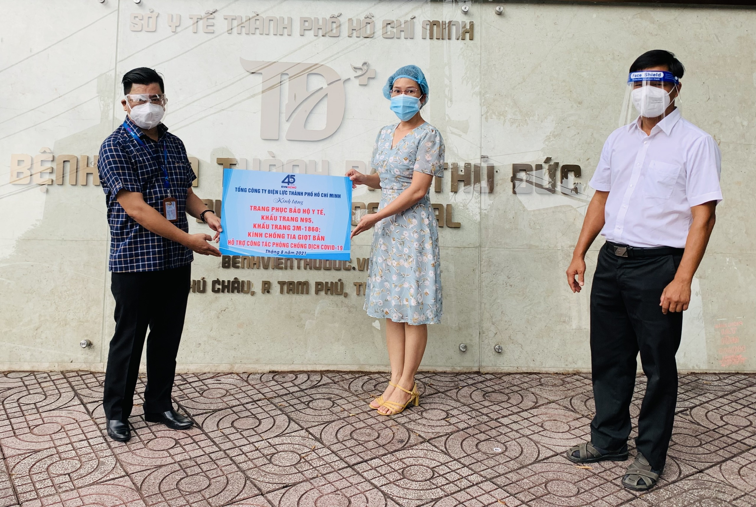 | Đồng chí Bùi Hải Thành - Phó Bí thư thường trực Đảng ủy EVNHCMC (bên trái) trao bảng tượng trưng tặng vật tư y tế thiết yếu cho Bệnh viện Thành phố Thủ Đức. |