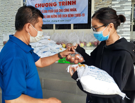 | Trao nhu yếu phẩm cho công nhân lao động TP Thủ Đức gặp khó khăn vì dịch COVID-19. |