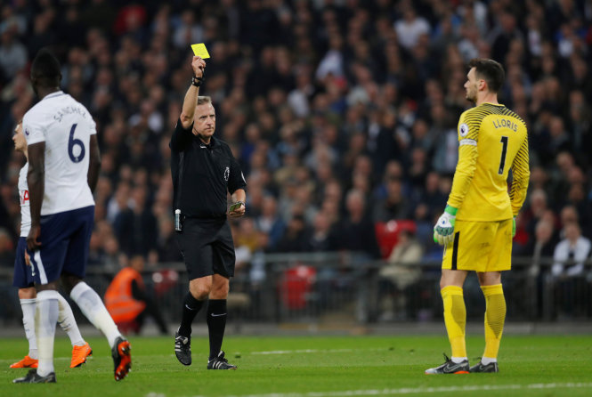 Lloris nhận thẻ vàng sau tình huống phạm lỗi với Sterling. Ảnh: Reuters