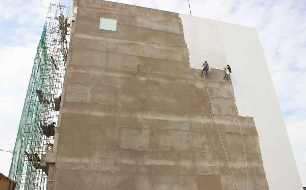 Ngồi dưới tán cây, ngước nhìn bạn đồng nghiệp cũng đang từ từ hạ độ cao, anh Tường nói: “Nhà này đâu có cao gì! Tòa 12 tầng, thậm chí 22 tầng, tôi còn đu dây được mà, nhưng đu mấy cái đó có dây bảo hiểm”. Nghỉ vài phút, các anh nhanh chóng bắt tay vào công việc. Thùng bột đầy ứ được mang lên sân thượng, miếng ván gỗ mắc vào dây bằng khóa kim loại, hành trình bắt đầu từ độ cao 20m. Các anh tuột dần xuống vị trí làm dang dở. Mỗi người một thùng sơn bên cạnh, tay cầm bay, tay cầm miếng nhựa gạt bột. Các anh di chuyển bằng cách đung đưa qua lại, nhoài người ra để trét xa hơn. Dưới nắng oi, hành trình lên xuống 6 tầng lầu cứ lặp lại cho đến khi cả bức tường khoác lên mình màu áo mới.