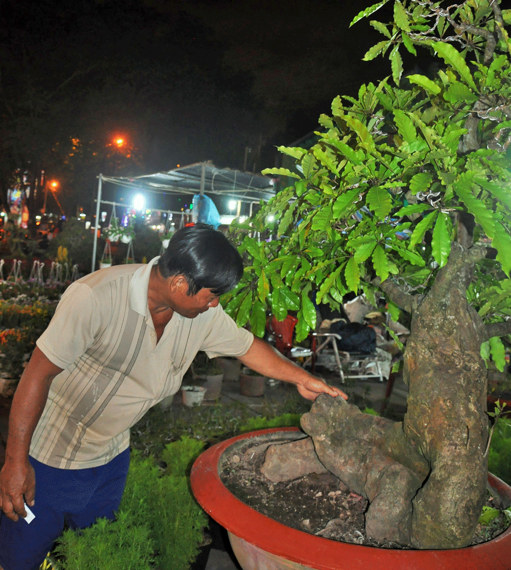 Ban đêm, được đi giữa không gian ngập tràn hoa, thong thả ngắm nhìn, hít khí trời thanh mát êm ả, người mê kiểng cổ bắt gặp cây Lộc vừng có bộ rễ quái thú thật đẹp của anh Tuấn, quê tỉnh Bến Tre, có giá khoảng 35 triệu đồng; gốc kiểng phát tài 16 đọt bắt mắt, trị giá 6 triệu đồng; hay gốc nhãn tiêu cổ thụ, có giá 15 triệu đồng;…