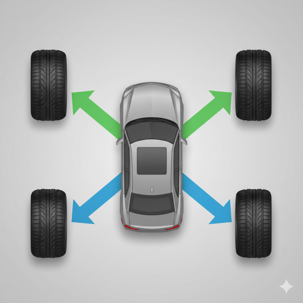 Với lốp không có gai định hướng, nên đảo bốn lốp theo dấu X để đảm bảo độ mài mòn đồng đều (ẢNH: AI)