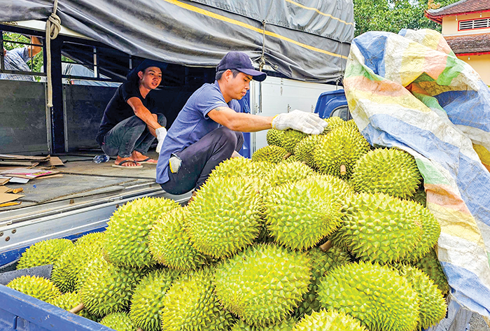 Sầu riêng Ri 6 tại huyện Phong Điền được tiểu thương thu mua đưa lên xe tải để chở đi các nơi tiêu thụ.