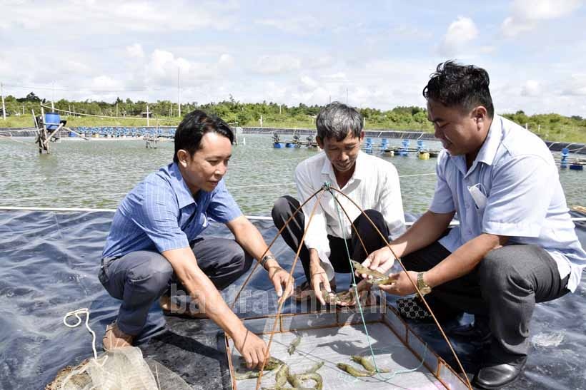 Lãnh đạo xã Long Sơn tham quan mô hình nuôi tôm của nông dân Trần Văn Ca (giữa).