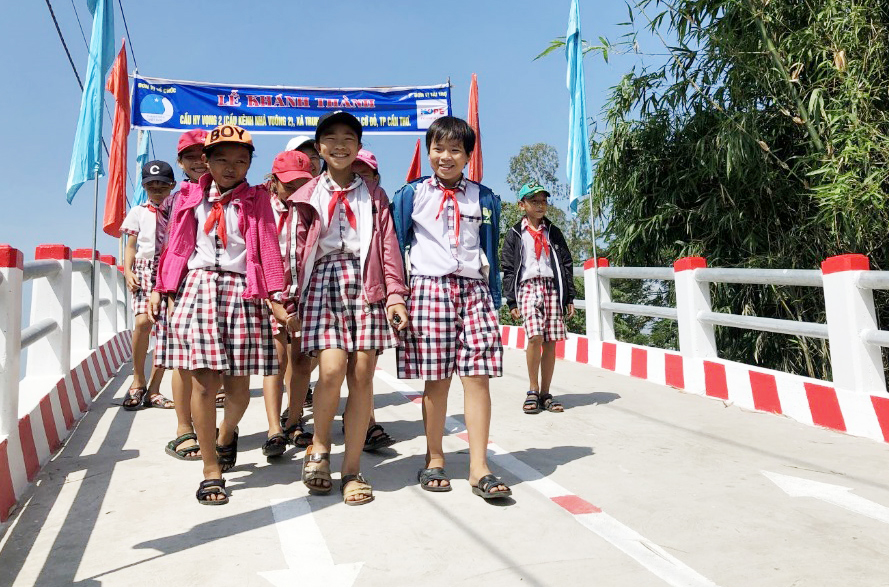 Cầu Hy vọng 2 (cầu kênh Nhà vuông 2) ở xã Trung Hưng, huyện Cờ Đỏ đưa vào sử dụng trong niềm vui của bà con và học sinh địa phương.